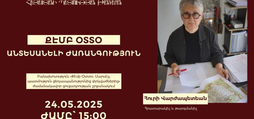 Մայիսի 24-ին՝ ժամը 15։00-ին, Հայաստանի պատմության թանգարանում տեղի կունենա «Քէմբ Օտտօ․ անտեսանելի ժառանգություն» խորագրով բանախոսությունը՝ Հայոց ցեղասպանության 110-րդ տարելիցին նվիրված «Քէմբ Օտտօ, Մարսէյլ․ պատմություն ցեղասպանությունից փրկվածներից» խորագիրը կրող ժամանակավոր ցուցադրության փակման և ամփոփման շրջանակներում։ Բանախոսությամբ հանդես կգա հրատարակիչ և թարգմանիչ ՛՛Editions Parenthèses, collection Diasporales՛՛-ի պատասխանատու Հուրի Վարժապետեանը, ով կներկայացնի «ARAM» հետազոտության և հայկական հիշողության արխիվների միության հետազոտություններն ու հայերեն թարգմանված նյութերը, կխոսի նաև Ֆրանսիայի Մարսել քաղաքի «Քէմբ Օտտօ» գաղթականական կայանում ապաստանած հայ գաղթականների առօրյայի և «ARAM» հետազոտության և հայկական հիշողության արխիվների միության կամավորների կատարած հետազոտությունների, ուսումնասիրությունների արդյունքում ցեղասպանությունը վերապրածների ժառանգներին գտնելու ուղղությամբ կատարված աշխատանքների մասին։