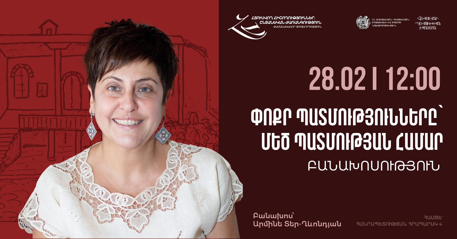 Փետրվարի 28-ին՝ ժամը 12։00-ին, «Հյուսվող հիշողություններ. ընտանեկան ժառանգություն» ժամանակավոր ցուցադրության ամփոփման և փակման շրջանակում, Հայաստանի պատմության թանգարանում տեղի կունենա բանախոսություն։ Թեմա՝ «Փոքր պատմությունները՝ մեծ պատմության համար» Բանախոս՝ Արմինե Տեր-Ղևոնդյան «Հյուսվ [...]