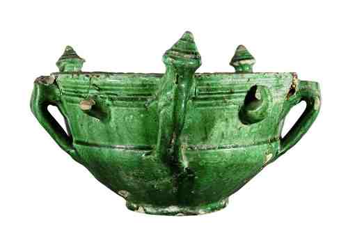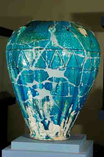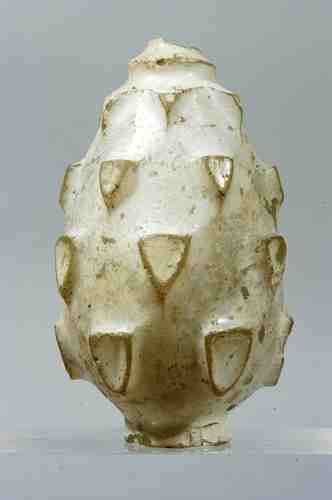 Պատված է փիրուզագույն ջնարակով: Իրանը հարդարված է ծաղկած ճյուղագալարներով, վերին մասում նշաձև 4 ծաղիկներ են, որոնց միջև պահպանվել են 4 ունկերի հետքերը: Հավաքածու : Հնագիտական հավաքածու Դարաշրջան ։ 12-13-րդ դդ․ Տարածաշրջան : Դվին Նյութ : Հախճապակի Ինվենտար # : 2837-33