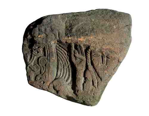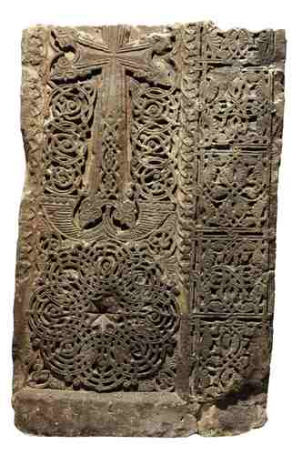 Եկեղեցու պատին զետեղված խաչաքանդակի հատված: Ուղղանկյունաձև սալի կենտրոնում բարձրանում է եռաբողբոջ թևածայրերով խաչ: Խաչապատկերի տակ քանդակազարդ մեծ վարդյակ է: Խաչաքանդակի շուրջը միահյուսված զարդաձևեր են և խաչազարդ քառանկյունիներ: Հավաքածու : Հնագիտական հավաքածու Դարաշրջան ։ 13-րդ դ. Տարած [...]