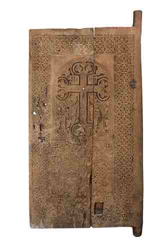 Դռան քանդակազարդ մակերեսը մշակված է հայկական դասական խաչքարերի հորինվածքով: Կենտրոնում՝ խոշոր սկավառակաձև վարդյակի վրա բարձրացված խաչ է, շուրջը բուսական և երկրաչափական զարդանախշեր: Հավաքածու : Հնագիտական հավաքածու Տարեթիվ։ 1614 թ․ Տարածաշրջան : Տաթևավանք, Սբ․ Գրիգոր եկեղեցի Նյութ : Փայտ [...]