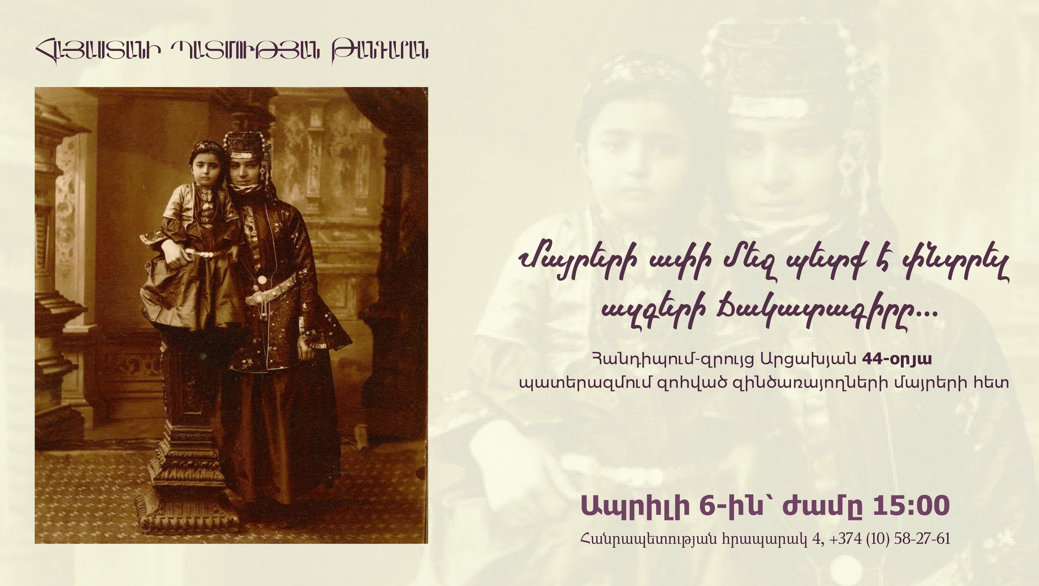 On the eve of Motherhood and Beauty Day, on 6 April, at 15:00, the History Museum of Armenia will host a meeting with the mothers of the servicemen who died in the 44-day war in April, entitled "The fate of nations should be sought in the palms of mothers..."; these are the women who fou [...]