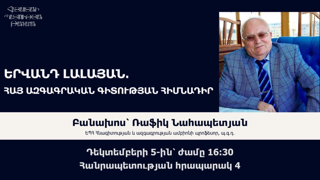 On 5 December at 16:30, as part of the celebration of the 160th anniversary of the birth of Yervand Lalayan, the History Museum of Armenia will host a lecture entitled “Yervand Lalayan: The Founder of Armenian Scientific Ethnography” by Professor Rafik Nahapetyan, Department of Archaeology and Ethnography, Yerevan State University. The speaker will present the […]