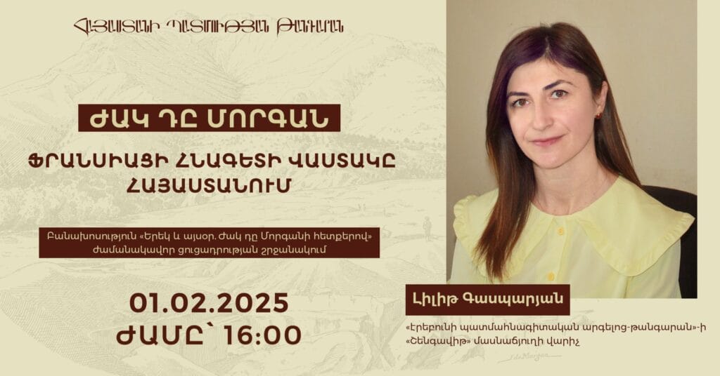 On 1 February at 16:00, as part of the temporary exhibition “Yesterday and Today: In the Footsteps of Jacques de Morgan”, the History Museum of Armenia will host a lecture entitled “Jacques de Morgan: The Merits of the French Archaeologist in Armenia”, given by Lilit Gasparyan, Head of the “Shengavit” Branch of the “Erebuni Historical […]