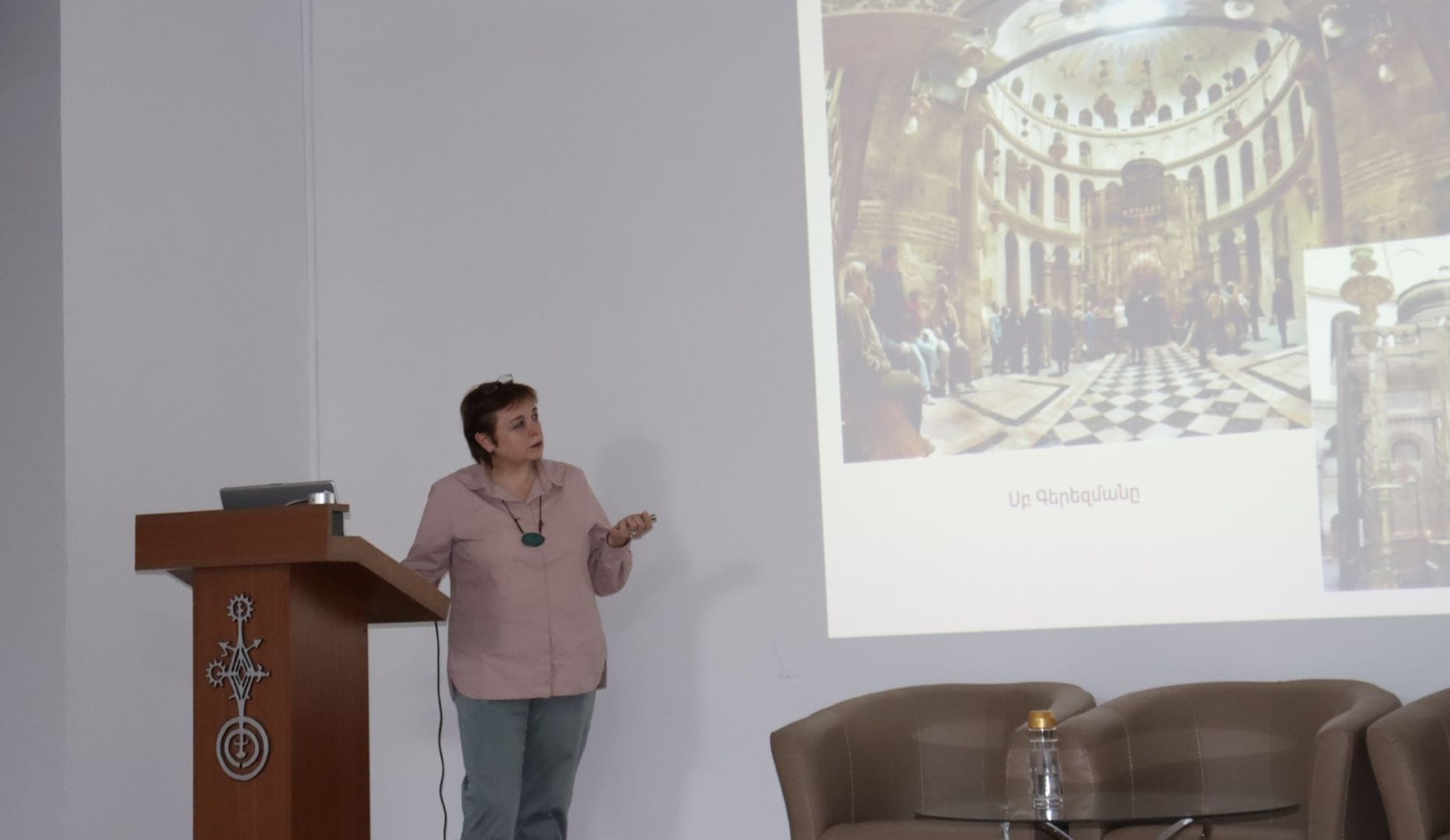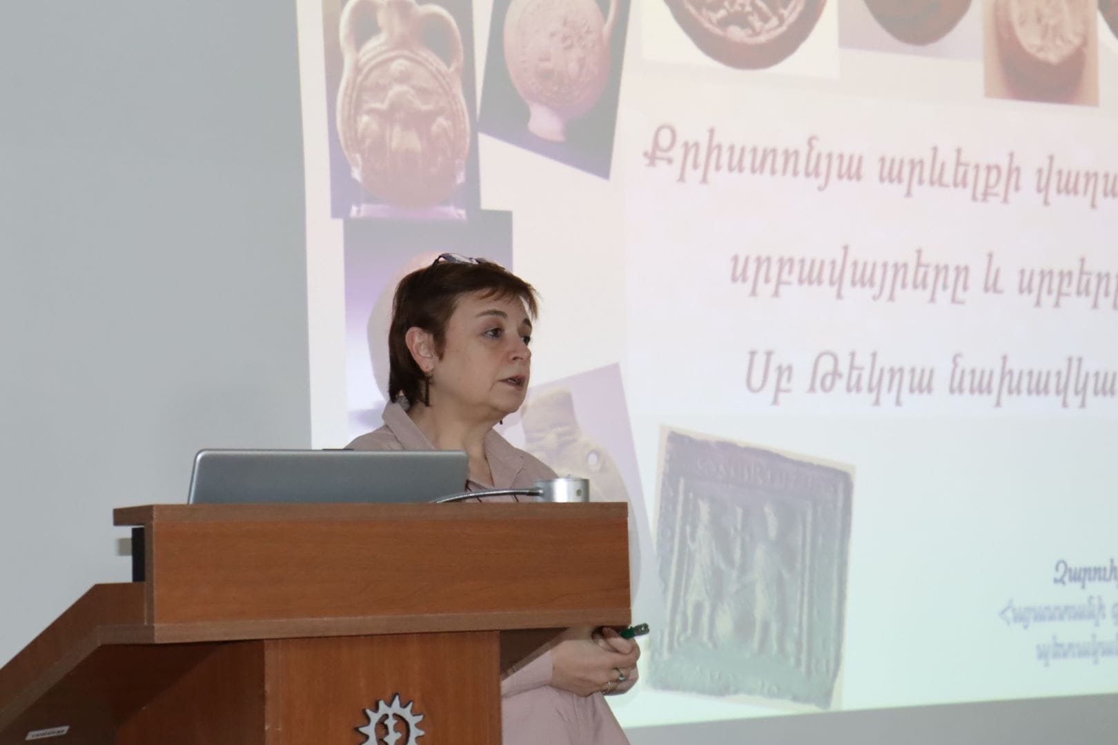 Բանախոսն անդրադարձավ Մերձավոր Արևելքի վաղքրիստոնեական մի քանի հայտնի սրբերին և սրբավայրերին, ինչպես նաև ուխտագնացների կողմից ձեռք բերվող առանձնահատուկ առարկաներին՝ տափաշշերին ու դրանց վրա առկա պատկերներին: Հատուկ անդրադարձ եղավ Սբ․ Թեկղա նախավկայի պաշտամունքի տարածմանը Մերձավոր Արևելքում և Հայաստանում՝ ի դեմս վաղմիջնադարյան հայկական քանդակում սրբուհու կերպարի «նորահայտ» օրինակների: